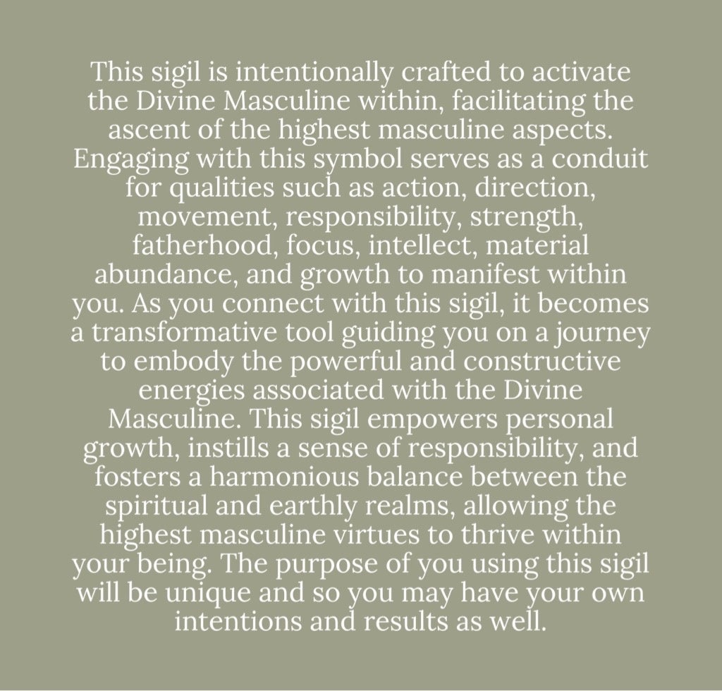 More about this sigil: This sigil is intentionally crafted to activate the Divine Masculine within, facilitating the ascent of the highest masculine aspects. Engaging with this symbol serves as a conduit for qualities such as action, direction, movement, responsibility, strength, fatherhood, focus, intellect, material abundance, and growth to manifest within you. As you connect with this sigil, it becomes a transformative tool guiding you on a journey to embody the powerful and constructive energies associated with the Divine Masculine. This sigil empowers personal growth, instills a sense of responsibility, and fosters a harmonious balance between the spiritual and earthly realms, allowing the highest masculine virtues to thrive within your being. The purpose of you using this sigil will be unique and so you may have your own intentions and results as well.