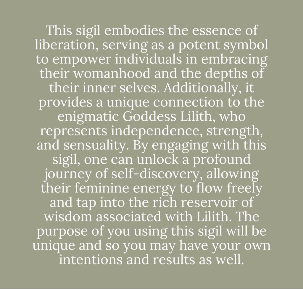 More about this sigil: This sigil embodies the essence of liberation, serving as a potent symbol to empower individuals in embracing their womanhood and the depths of their inner selves. Additionally, it provides a unique connection to the enigmatic Goddess Lilith, who represents independence, strength, and sensuality. By engaging with this sigil, one can unlock a profound journey of self-discovery, allowing their feminine energy to flow freely and tap into the rich reservoir of wisdom associated with Lilith. The purpose of you using this sigil will be unique and so you may have your own intentions and results as well.