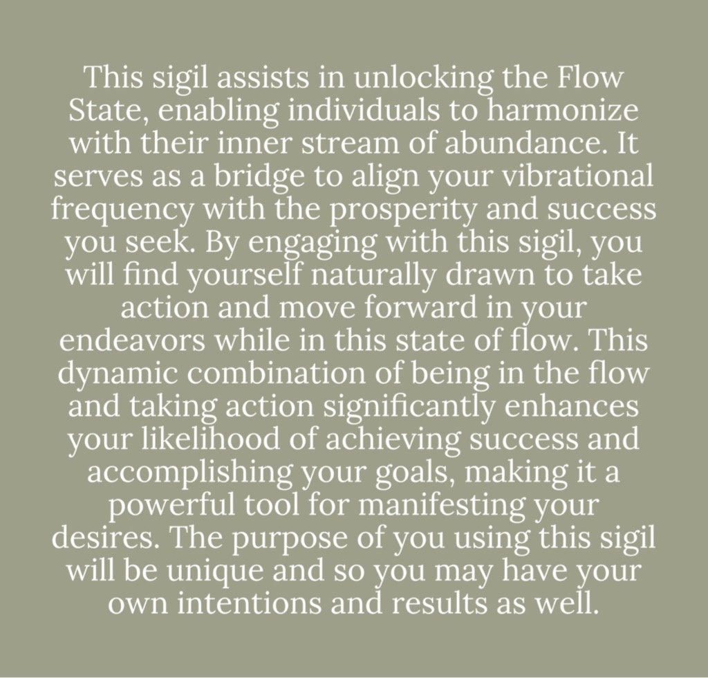 More about this sigil: This sigil assists in unlocking the Flow State, enabling individuals to harmonize with their inner stream of abundance. It serves as a bridge to align your vibrational frequency with the prosperity and success you seek. By engaging with this sigil, you will find yourself naturally drawn to take action and move forward in your endeavors while in this state of flow. This dynamic combination of being in the flow and taking action significantly enhances your likelihood of achieving success and accomplishing your goals, making it a powerful tool for manifesting your desires. The purpose of you using this sigil will be unique and so you may have your own intentions and results as well.