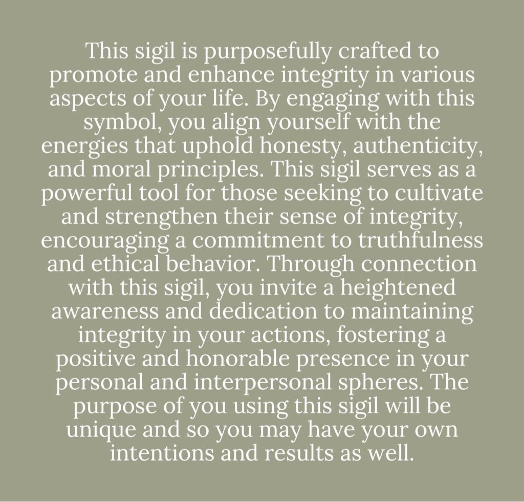 More about this sigil: This sigil is purposefully crafted to promote and enhance integrity in various aspects of your life. By engaging with this symbol, you align yourself with the energies that uphold honesty, authenticity, and moral principles. This sigil serves as a powerful tool for those seeking to cultivate and strengthen their sense of integrity, encouraging a commitment to truthfulness and ethical behavior. Through connection with this sigil, you invite a heightened awareness and dedication to maintaining integrity in your actions, fostering a positive and honorable presence in your personal and interpersonal spheres. The purpose of you using this sigil will be unique and so you may have your own intentions and results as well.
