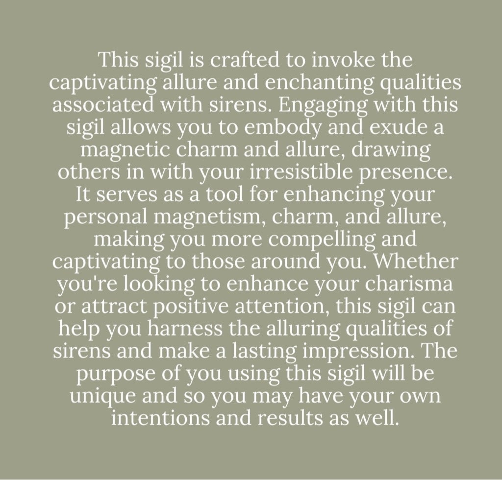 More about this sigil: This sigil is crafted to invoke the captivating allure and enchanting qualities associated with sirens. Engaging with this sigil allows you to embody and exude a magnetic charm and allure, drawing others in with your irresistible presence. It serves as a tool for enhancing your personal magnetism, charm, and allure, making you more compelling and captivating to those around you. Whether you’re looking to enhance your charisma or attract positive attention, this sigil can help you harness the alluring qualities of sirens and make a lasting impression. The purpose of you using this sigil will be unique and so you may have your own intentions and results as well.