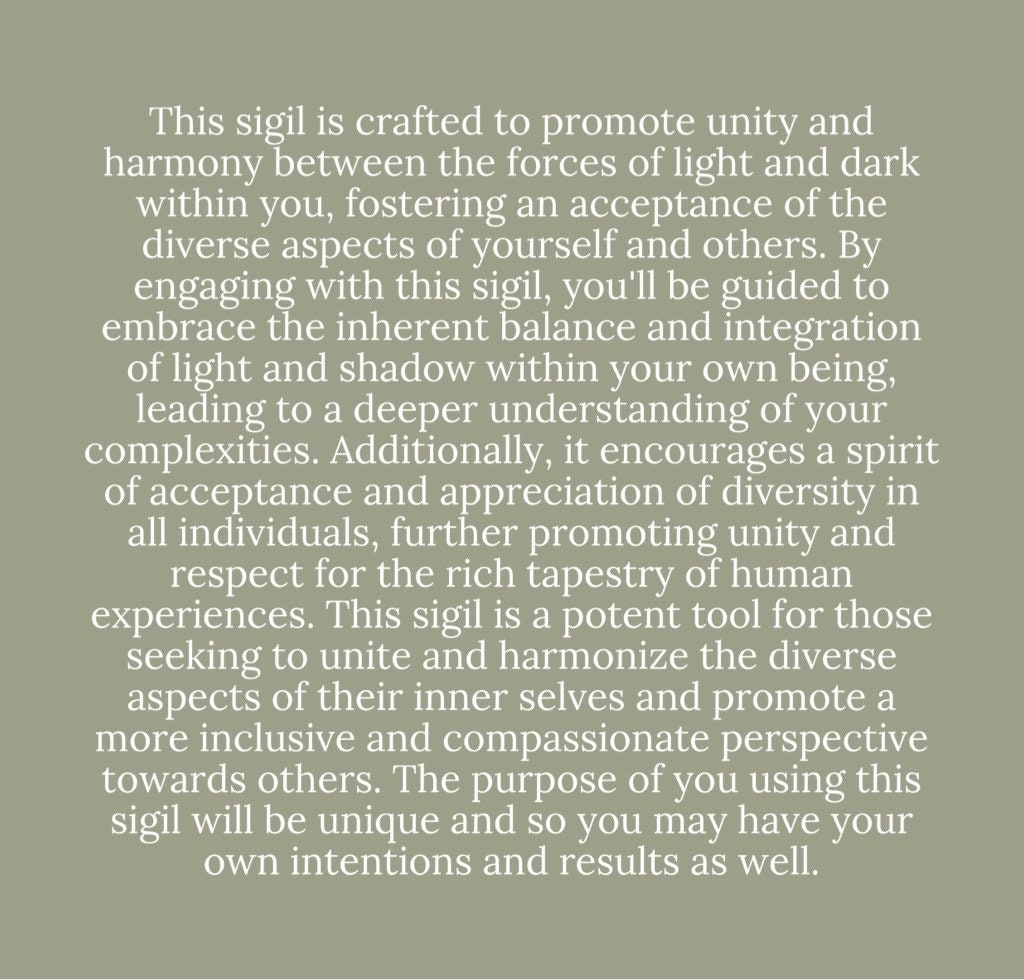 More about this sigil: This sigil is crafted to promote unity and harmony between the forces of light and dark within you, fostering an acceptance of the diverse aspects of yourself and others. By engaging with this sigil, you’ll be guided to embrace the inherent balance and integration of light and shadow within your own being, leading to a deeper understanding of your complexities. Additionally, it encourages a spirit of acceptance and appreciation of diversity in all individuals, further promoting unity and respect for the rich tapestry of human experiences. This sigil is a potent tool for those seeking to unite and harmonize the diverse aspects of their inner selves and promote a more inclusive and compassionate perspective towards others. The purpose of you using this sigil will be unique and so you may have your own intentions and results as well.