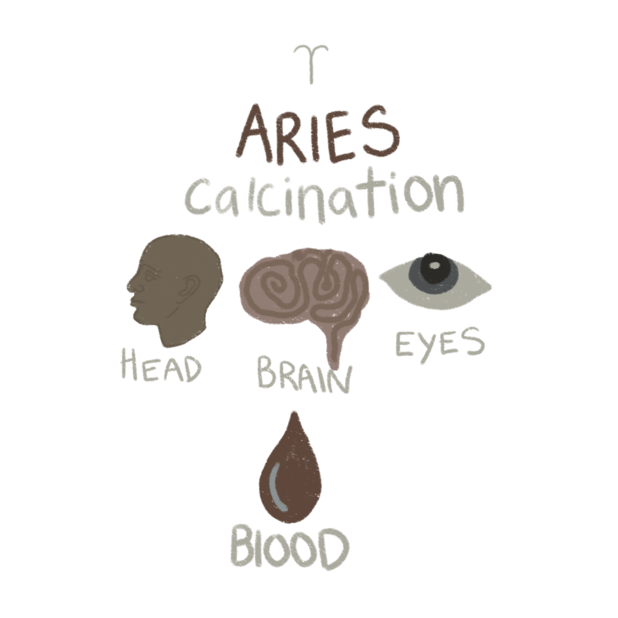 Aries rules the head, face, brain, eyes, and blood. These are the seats of identity, initiation, and command. Aries corresponds to the alchemical process of Calcination, where fire is applied to matter to burn away impurities. This stage represents the breakdown of false identity and the confrontation of ego. The head is where selfhood takes form and is challenged. Calcination is the pressure that exposes what is no longer true.