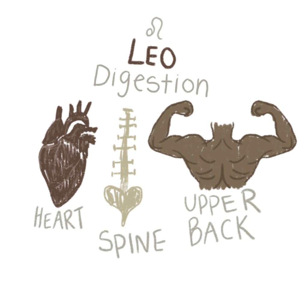 Leo rules the heart, spine, and upper back. It governs the sustaining fire that keeps life moving. Leo corresponds to the alchemical process of Digestion, where steady heat transforms matter over time. This stage represents the maturing of what has already been broken down. Leo carries the rhythm of integration, the creative pulse that gives life its coherence and vitality. Digestion is the soul’s process of holding, refining, and deepening what has been received.