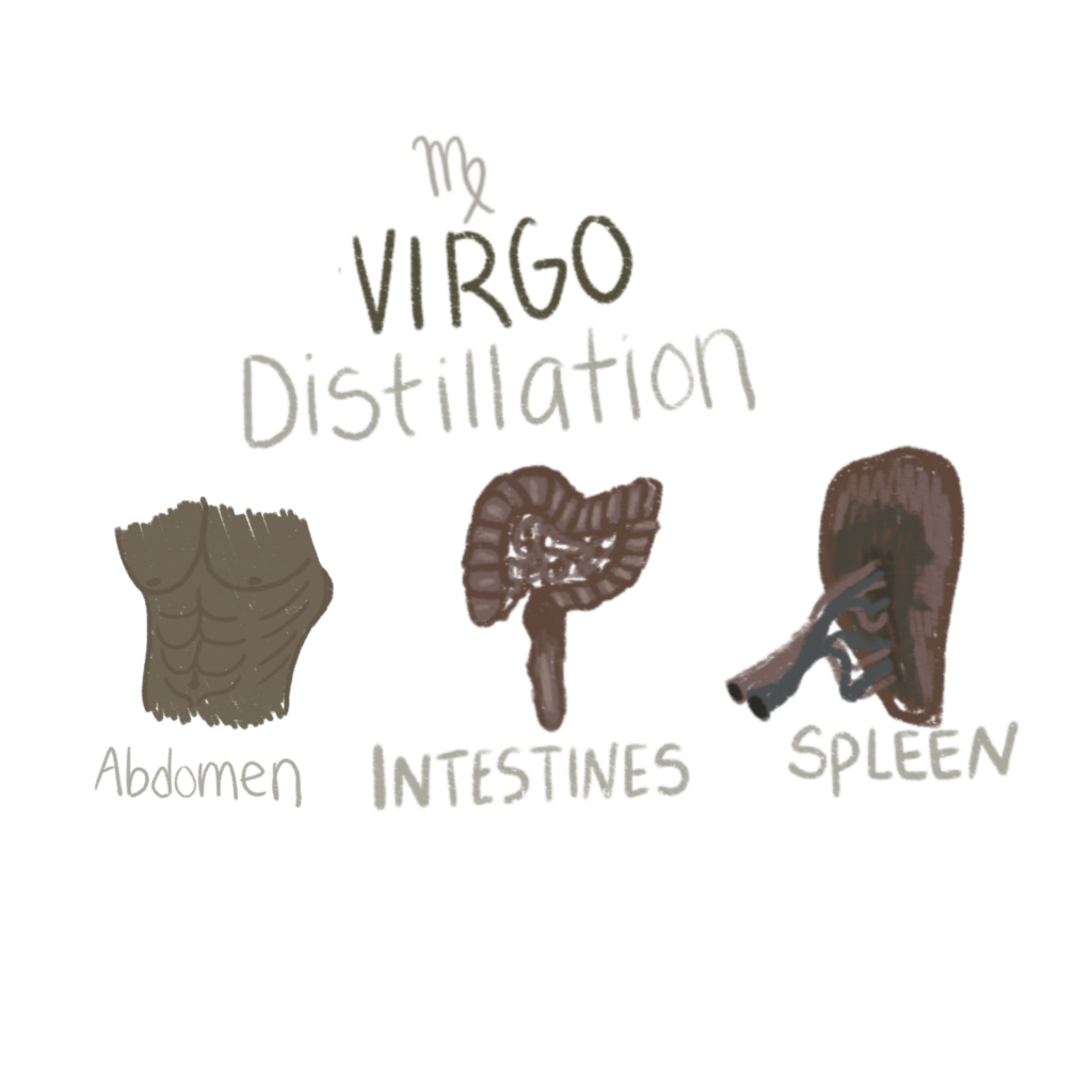 Virgo rules the abdomen, intestines, and spleen. It corresponds to the alchemical process of Distillation, where a substance is heated, purified, and condensed to isolate its essential components. This is the phase of refinement through repetition. Virgo governs the part of the body that sorts, assimilates, and eliminates, deciding what is useful and what must be released. It is the internal filter, extracting truth from complexity. Distillation clarifies by removing what clouds the essence.