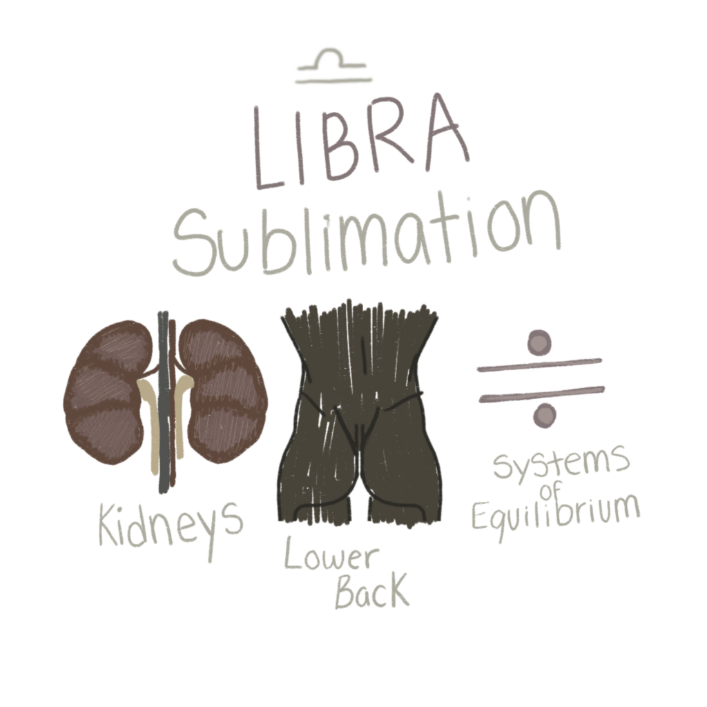 Libra rules the kidneys, lower back, and the body’s systems of equilibrium. It corresponds to the alchemical process of Sublimation, where purified matter is lifted upward into a refined state. This is the stage where the dense is made subtle and the heavy is transformed into essence. Libra governs balance through clear perception, proportion, and harmony. Sublimation is the movement toward clarity. It is the elevation that comes when opposites are brought into alignment.