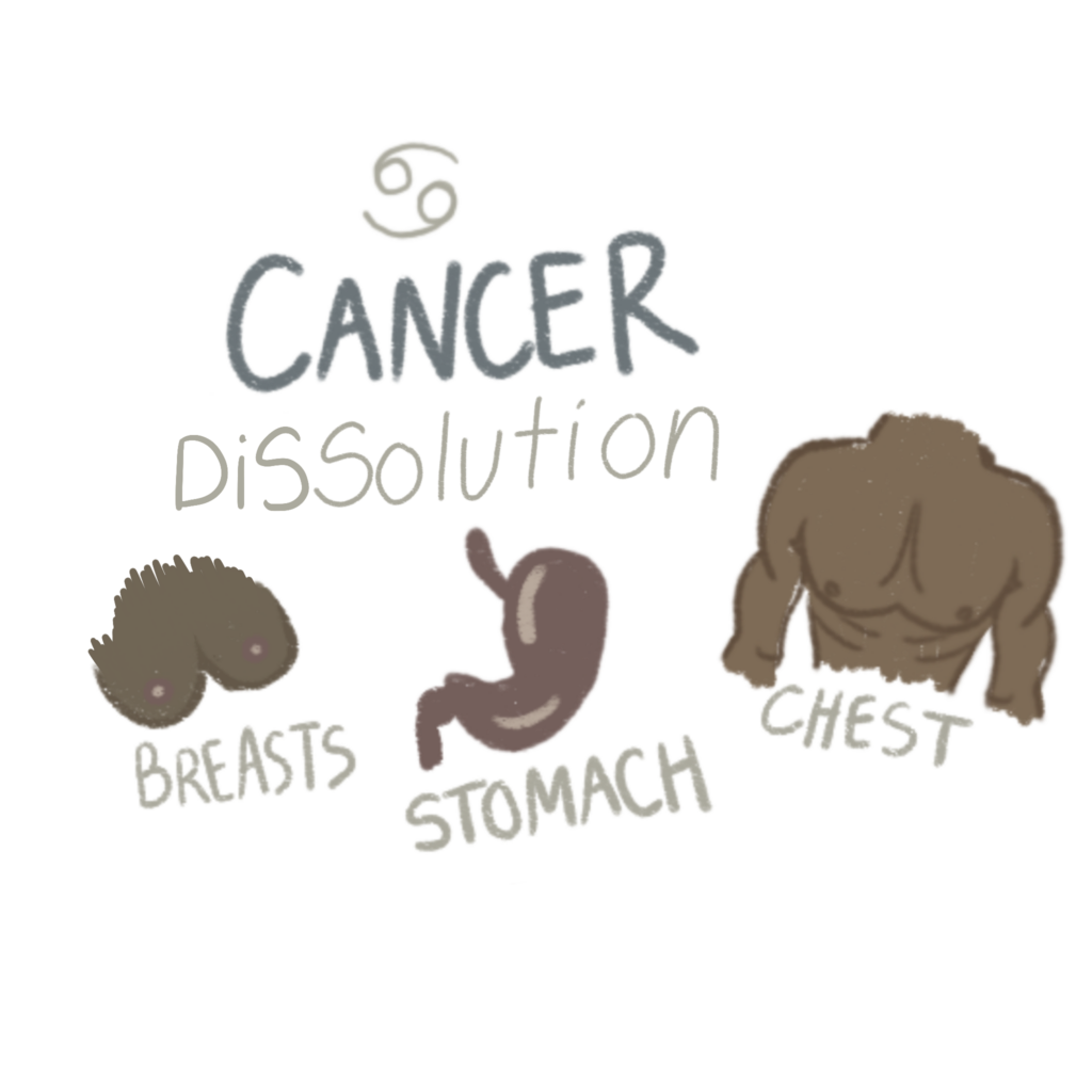 Cancer rules the chest, breasts, and stomach. It corresponds to the alchemical process of Dissolution, the dissolving of solid matter in liquid. This is the stage where fixed structures begin to soften. Cancer governs emotional absorption, psychic sensitivity, and the capacity to receive and transform. It processes experience inwardly, breaking it down into something digestible. Dissolution allows what is rigid to become fluid again, creating the space for deeper integration.