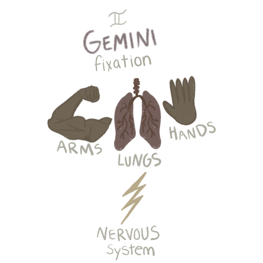 Gemini rules the arms, shoulders, hands, lungs, and nervous system. It corresponds to the alchemical process of Fixation, the stage where a substance is held stable under heat. Gemini governs the coordination of thought and movement, the connection of mind and matter. Fixation represents the mental and communicative structures that stabilize consciousness, allowing awareness to stay grounded while energy moves.