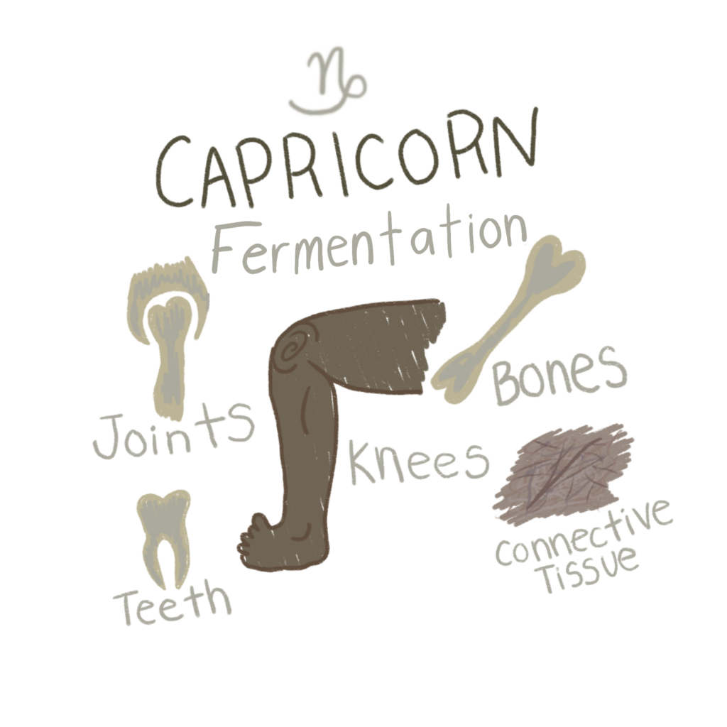 Capricorn rules the knees, bones, joints, connective tissue, and teeth. It corresponds to the alchemical process of Fermentation, where from decay and death, a new living essence arises. This is the spiritual rebirth after all has been broken down. Capricorn governs the discipline and structure that provide the fertile ground for this new growth. Fermentation is the spark of spiritual vitality that rises from long effort and endurance.